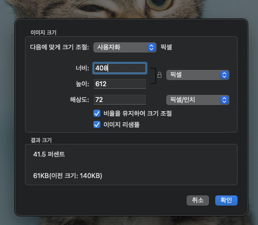 사진을 다운받고 맥북의 미리보기 앱으로 가로를 408로 변경하면, 세로가 612로 딱 맞습니다.
