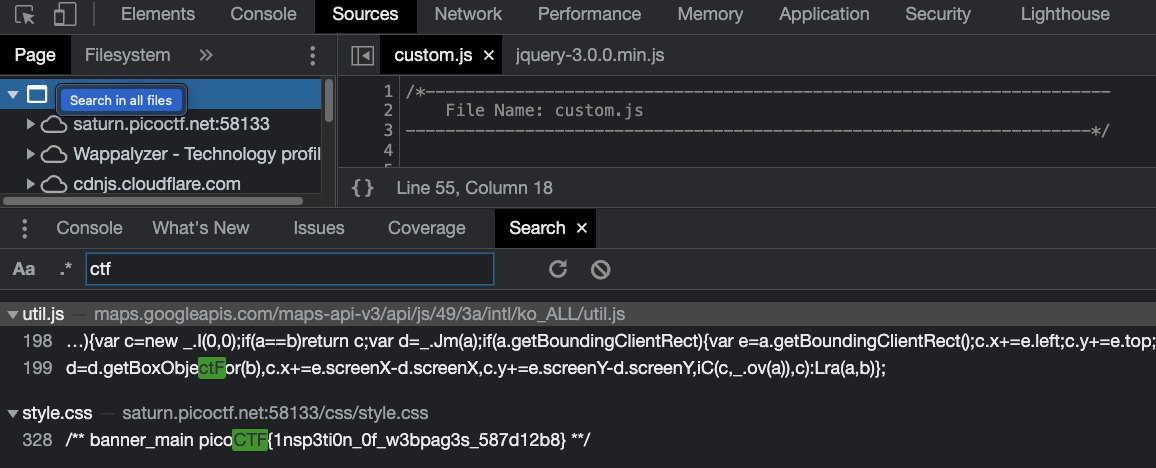 Sources 탭에서 Search in all files 을 누르고 flag를 검색합니다.