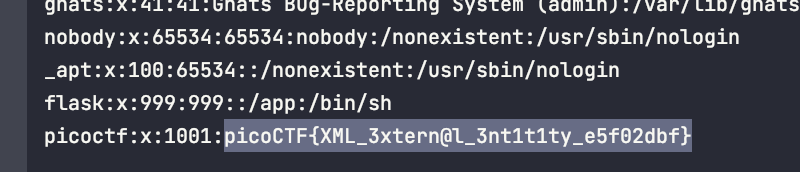flag는 /etc/passwd에 있다고 했기 때문에 XML을 삽입해서 flag 읽어옵니다.